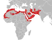 Cette espèce se rencontre dans le nord de l'Afrique, au Moyen-Orient (Turquie exceptée) et dans l'est de l'Asie du Sud[1].