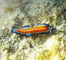 Le motif dorsal est bleu, avec une bande longitudinale orange séparée en deux par une fine bande blanche, et une bordure violet profond à rouge [1],[2],[Publication originale 1]. Le motif dorsal de fond, bleu clair à bleu ciel brillant, s'assombrit vers les bords. La ligne longitudinale médiane blanche qui sépare la bande longitudinale médiane orange prend naissance en avant des ocelles cérébraux et se termine en avant du bord postérieur. La bande marginale, étroite à large, est d'un violet profond qui peut apparaître rouge brillant sur les photographies. Une bande variable de blanc est présente entre les zones orange et bleue[Publication originale 1].