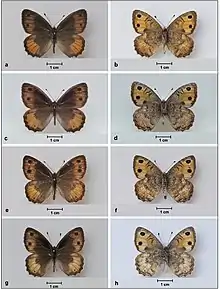 Le revers, beige très clair, présente les mêmes deux ocelles aux antérieures sur une bande ivoire.