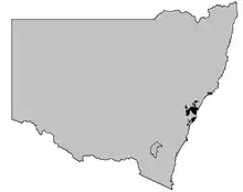 Cette espèce est endémique de Nouvelle-Galles du Sud. Elle se rencontre entre 10 et 1 000 m d'altitude du parc national Royal à Gosford et à Newcastle[1],[2].
