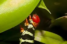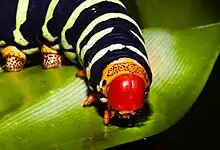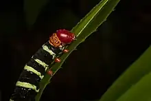 La chenille est de grande taille, à rayures de couleur jaune et noire et à tête rouge-orange. Sur l'arrière du corps, elle possède un filament qui oscille dans un mouvement de va-et-vient lors de sa marche.
