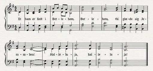 | 1 | Puer natus in Bethlehem, alleluia, Unde gaudet Ierusalem, alleluia, alleluia. | Un enfant est né à Bethléem, alléluia, Jérusalem s'en réjouit, alléluia, alléluia. |