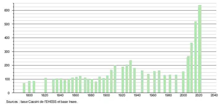 L'évolution du nombre d'habitants est connue à travers les recensements de la population effectués dans la commune depuis 1793. Pour les communes de moins de 10 000 habitants, une enquête de recensement portant sur toute la population est réalisée tous les cinq ans, les populations légales des années intermédiaires étant quant à elles estimées par interpolation ou extrapolation[21]. Pour la commune, le premier recensement exhaustif entrant dans le cadre du nouveau dispositif a été réalisé en 2005[22].