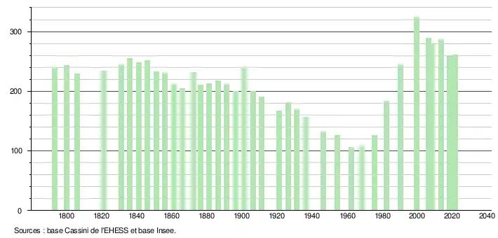 L'évolution du nombre d'habitants est connue à travers les recensements de la population effectués dans la commune depuis 1793. Pour les communes de moins de 10 000 habitants, une enquête de recensement portant sur toute la population est réalisée tous les cinq ans, les populations légales des années intermédiaires étant quant à elles estimées par interpolation ou extrapolation[26]. Pour la commune, le premier recensement exhaustif entrant dans le cadre du nouveau dispositif a été réalisé en 2008[27].