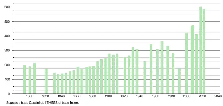 L'évolution du nombre d'habitants est connue à travers les recensements de la population effectués dans la commune depuis 1793. Pour les communes de moins de 10 000 habitants, une enquête de recensement portant sur toute la population est réalisée tous les cinq ans, les populations légales des années intermédiaires étant quant à elles estimées par interpolation ou extrapolation[27]. Pour la commune, le premier recensement exhaustif entrant dans le cadre du nouveau dispositif a été réalisé en 2007[28].