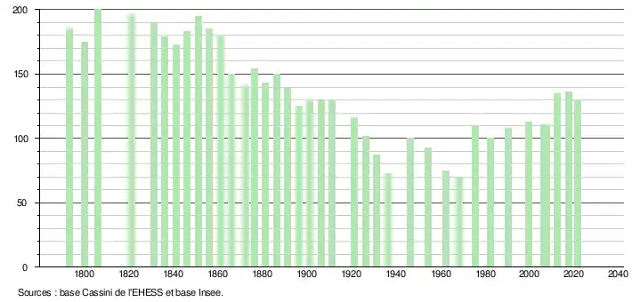L'évolution du nombre d'habitants est connue à travers les recensements de la population effectués dans la commune depuis 1793. Pour les communes de moins de 10 000 habitants, une enquête de recensement portant sur toute la population est réalisée tous les cinq ans, les populations légales des années intermédiaires étant quant à elles estimées par interpolation ou extrapolation[19]. Pour la commune, le premier recensement exhaustif entrant dans le cadre du nouveau dispositif a été réalisé en 2007[20].