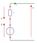 D'un point de vue électrique, on peut modéliser un dipôle actif linéaire (électromoteur) par un Modèle équivalent de Thévenin (MET). Remarque : ce modèle est très sommaire et ne rend compte que de la chute de tension en charge ou des puissances électriques mises en jeu que dans un domaine de validité qui doit toujours être précisé. En convention générateur (flèche de tension et sens du courant dans le même sens), le schéma équivalent du dipôle est donc le suivant :