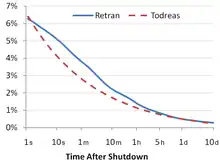 Au cours du fonctionnement du réacteur, la puissance thermique totale ci-dessus est extraite du cœur ou des structures proches de celui-ci, mais en cas d'arrêt du réacteur, la chaleur dégagée par les produits de fissions en cours de désintégration continue d'être produite jusqu'à atteindre un état stable.