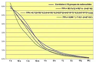 Si e est l'énergie de désintégration, la puissance résiduelle émise par la quantité Q de radionucléides présents à la fin du palier est égale à . A l'instant t post arrêt du réacteur la puissance résiduelle vaut :