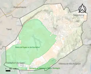 L’inventaire des zones naturelles d'intérêt écologique, faunistique et floristique (ZNIEFF) a pour objectif de réaliser une couverture des zones les plus intéressantes sur le plan écologique, essentiellement dans la perspective d’améliorer la connaissance du patrimoine naturel national et de fournir aux différents décideurs un outil d’aide à la prise en compte de l’environnement dans l’aménagement du territoire. Deux ZNIEFF de type 1[Note 1] sont recensées sur la commune[7] : les « garrigues et falaises du Grand Montagné » (264 ha), couvrant 4 communes du département[8], et la « plaine de Pujaut et de Rochefort » (1 368 ha), couvrant 3 communes du département[9].