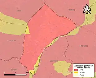 Le retrait-gonflement des sols argileux est susceptible d'engendrer des dommages importants aux bâtiments en cas d’alternance de périodes de sécheresse et de pluie. La totalité de la commune est en aléa moyen ou fort (67,4 % au niveau départemental et 48,5 % au niveau national). Sur les 391 bâtiments dénombrés sur la commune en 2019, 391 sont en aléa moyen ou fort, soit 100 %, à comparer aux 84 % au niveau départemental et 54 % au niveau national. Une cartographie de l'exposition du territoire national au retrait gonflement des sols argileux est disponible sur le site du BRGM[23],[Carte 2].