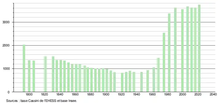 L'évolution du nombre d'habitants est connue à travers les recensements de la population effectués dans la commune depuis 1793. Pour les communes de moins de 10 000 habitants, une enquête de recensement portant sur toute la population est réalisée tous les cinq ans, les populations légales des années intermédiaires étant quant à elles estimées par interpolation ou extrapolation[29]. Pour la commune, le premier recensement exhaustif entrant dans le cadre du nouveau dispositif a été réalisé en 2006[30].