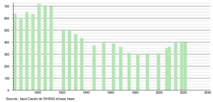 L'évolution du nombre d'habitants est connue à travers les recensements de la population effectués dans la commune depuis 1881. Pour les communes de moins de 10 000 habitants, une enquête de recensement portant sur toute la population est réalisée tous les cinq ans, les populations légales des années intermédiaires étant quant à elles estimées par interpolation ou extrapolation[17]. Pour la commune, le premier recensement exhaustif entrant dans le cadre du nouveau dispositif a été réalisé en 2008[18].