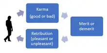 Dans le bouddhisme, puṇya signifie « mérite » ou « accumulation de mérites ». Les sources pali décrivent trois sortes de causes produisant du mérite : la générosité (dāna), la moralité (shila) et la méditation (bhavana) [3].