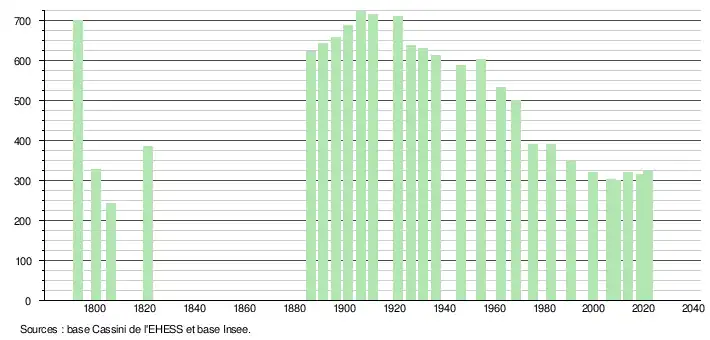 L'évolution du nombre d'habitants est connue à travers les recensements de la population effectués dans la commune depuis 1793. Pour les communes de moins de 10 000 habitants, une enquête de recensement portant sur toute la population est réalisée tous les cinq ans, les populations légales des années intermédiaires étant quant à elles estimées par interpolation ou extrapolation[20]. Pour la commune, le premier recensement exhaustif entrant dans le cadre du nouveau dispositif a été réalisé en 2008[21].