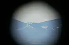 Vue aérienne du puy de Dôme depuis l'ouest avec Clermont-Ferrand au second plan et, à l'horizon, le mont Blanc, distant de 315 km.