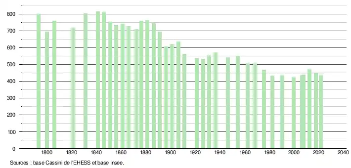 L'évolution du nombre d'habitants est connue à travers les recensements de la population effectués dans la commune depuis 1793. Pour les communes de moins de 10 000 habitants, une enquête de recensement portant sur toute la population est réalisée tous les cinq ans, les populations légales des années intermédiaires étant quant à elles estimées par interpolation ou extrapolation[33]. Pour la commune, le premier recensement exhaustif entrant dans le cadre du nouveau dispositif a été réalisé en 2007[34].