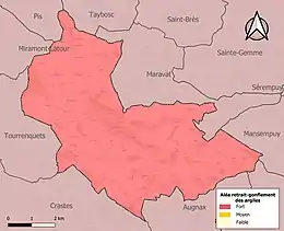 Le retrait-gonflement des sols argileux est susceptible d'engendrer des dommages importants aux bâtiments en cas d’alternance de périodes de sécheresse et de pluie. La totalité de la commune est en aléa moyen ou fort (94,5 % au niveau départemental et 48,5 % au niveau national). Sur les 242 bâtiments dénombrés sur la commune en 2019, 242 sont en aléa moyen ou fort, soit 100 %, à comparer aux 93 % au niveau départemental et 54 % au niveau national. Une cartographie de l'exposition du territoire national au retrait gonflement des sols argileux est disponible sur le site du BRGM[21],[Carte 2].