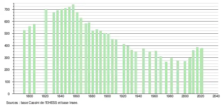 L'évolution du nombre d'habitants est connue à travers les recensements de la population effectués dans la commune depuis 1793. Pour les communes de moins de 10 000 habitants, une enquête de recensement portant sur toute la population est réalisée tous les cinq ans, les populations légales des années intermédiaires étant quant à elles estimées par interpolation ou extrapolation[31]. Pour la commune, le premier recensement exhaustif entrant dans le cadre du nouveau dispositif a été réalisé en 2005[32].