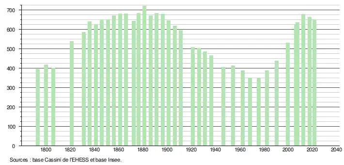 L'évolution du nombre d'habitants est connue à travers les recensements de la population effectués dans la commune depuis 1793. Pour les communes de moins de 10 000 habitants, une enquête de recensement portant sur toute la population est réalisée tous les cinq ans, les populations légales des années intermédiaires étant quant à elles estimées par interpolation ou extrapolation[22]. Pour la commune, le premier recensement exhaustif entrant dans le cadre du nouveau dispositif a été réalisé en 2007[23].