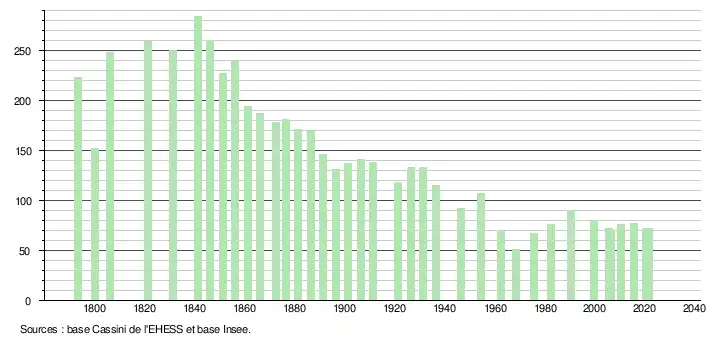 - Population municipale légale en vigueur au 1er janvier 2024, millésimée 2021, définie dans les limites territoriales en vigueur au 1er janvier 2023, date de référence statistique : 1er janvier 2021.