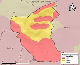 Le retrait-gonflement des sols argileux est susceptible d'engendrer des dommages importants aux bâtiments en cas d’alternance de périodes de sécheresse et de pluie. La totalité de la commune est en aléa moyen ou fort (88,8 % au niveau départemental et 48,5 % au niveau national). Sur les 66 bâtiments dénombrés sur la commune en 2019, 66 sont en aléa moyen ou fort, soit 100 %, à comparer aux 98 % au niveau départemental et 54 % au niveau national. Une cartographie de l'exposition du territoire national au retrait gonflement des sols argileux est disponible sur le site du BRGM[25],[Carte 3].