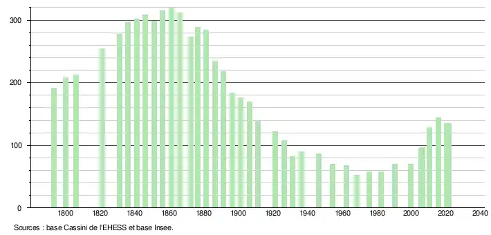L'évolution du nombre d'habitants est connue à travers les recensements de la population effectués dans la commune depuis 1793. Pour les communes de moins de 10 000 habitants, une enquête de recensement portant sur toute la population est réalisée tous les cinq ans, les populations légales des années intermédiaires étant quant à elles estimées par interpolation ou extrapolation[29]. Pour la commune, le premier recensement exhaustif entrant dans le cadre du nouveau dispositif a été réalisé en 2005[30].