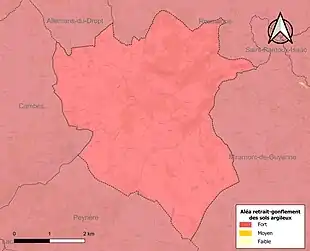 Le retrait-gonflement des sols argileux est susceptible d'engendrer des dommages importants aux bâtiments en cas d’alternance de périodes de sécheresse et de pluie[19]. La totalité de la commune est en aléa moyen ou fort (91,8 % au niveau départemental et 48,5 % au niveau national)[Carte 2]. Depuis le , en application de la loi ELAN, différentes contraintes s'imposent aux vendeurs, maîtres d'ouvrages ou constructeurs de biens situés dans une zone classée en aléa moyen ou fort[Note 3],[20].