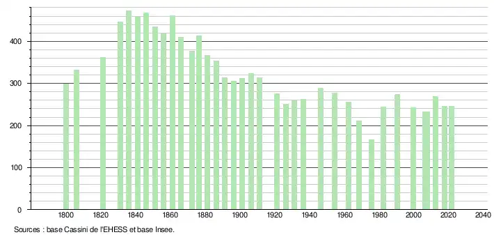 L'évolution du nombre d'habitants est connue à travers les recensements de la population effectués dans la commune depuis 1800. Pour les communes de moins de 10 000 habitants, une enquête de recensement portant sur toute la population est réalisée tous les cinq ans, les populations légales des années intermédiaires étant quant à elles estimées par interpolation ou extrapolation[22]. Pour la commune, le premier recensement exhaustif entrant dans le cadre du nouveau dispositif a été réalisé en 2007[23].