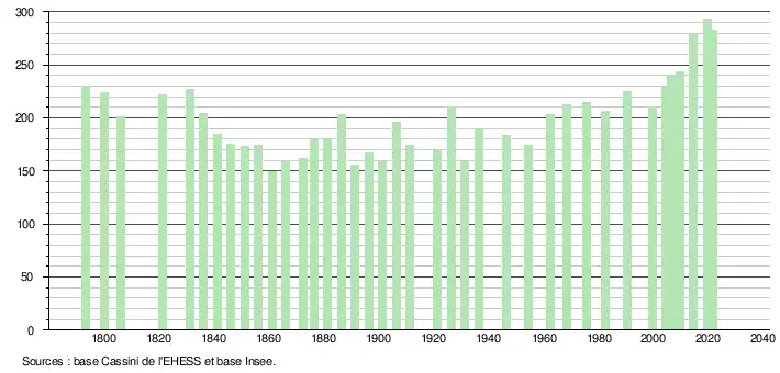 L'évolution du nombre d'habitants est connue à travers les recensements de la population effectués dans la commune depuis 1793. Pour les communes de moins de 10 000 habitants, une enquête de recensement portant sur toute la population est réalisée tous les cinq ans, les populations légales des années intermédiaires étant quant à elles estimées par interpolation ou extrapolation[33]. Pour la commune, le premier recensement exhaustif entrant dans le cadre du nouveau dispositif a été réalisé en 2004[34].
