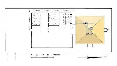 La pyramide et le temple funéraire étaient situés dans une vaste enceinte à redans commune aux ensembles funéraires royaux du Moyen Empire. Cette dernière mesurait 385 × 158 mètres environ. Une chaussée reliait le temple funéraire au temple de la vallée aujourd'hui disparu. Une petite chapelle funéraire était accolée à la face nord de la pyramide.
