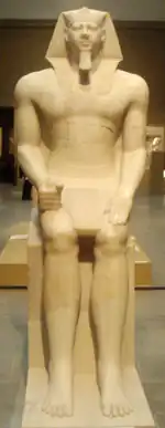 Des statues fragmentaires en albâtre ont été découvertes dans ce temple par George Andrew Reisner qui effectua de 1906 à 1924 des fouilles exhaustives sur le site. Ces fragments sont conservés au Musée des Beaux-Arts de Boston, et certains ont pu être assemblés et reconstituant la statue, qui nous présente un colosse du roi, figuré jeune, coiffé du némès et vêtu d'un pagne de lin fin plissé.