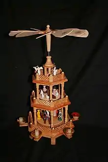 - (de) Cet article est partiellement ou en totalité issu de l’article de Wikipédia en allemand intitulé « Weihnachtspyramide » (voir la liste des auteurs).