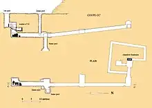 Ce puits vertical (2e puits sur la figure) de douze mètres aboutit à un corridor menant droit vers les appartements funéraires creusés dans le massif rocheux, sous la pyramide. Le premier corridor mène, au sud vers une tombe antérieure au monument (tombe no 10) à laquelle on accède également par un puits (1er puits sur la figure) plus large que le précédent. La tombe et le corridor sont séparés par une dalle de granit aujourd'hui perforée. L'architecte a sans doute voulu tirer avantage de cette crypte afin de décourager d'éventuels profanateurs de tombes royales. Vers le nord, le corridor aboutit à une sorte d'antichambre munie d'un 3e puits envahi par les eaux et dont la profondeur n'a pu être évaluée.