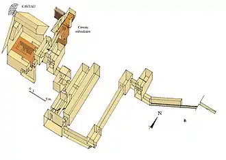 Les Égyptiens avaient conçu, fait peu commun, un second caveau dont le plan est similaire à celui que l'on trouve à la pyramide nord de Mazghouna et à la pyramide d'Amény-Qémaou. Il consiste en une cuve évidée pour recevoir le sarcophage dont le couvercle prend place dans une antichambre. Une fois le sarcophage scellé, une herse de granite devait séparer la cuve de l'antichambre où reposait le couvercle. Cependant, comme dans les pyramides précédemment citées, le couvercle git toujours dans l'antichambre, le sarcophage n'ayant jamais rempli son office. Il est curieux, ici, que les Égyptiens aient pris tant de peine à concevoir un système de séparation entre le sarcophage et l'antichambre où reposait le couvercle, cette antichambre ne communiquant avec rien.