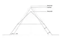 Tout d'abord, des joints alignés sur les quatre faces des corridors suggèrent que les entrées étaient primitivement situées à 12,6 mètres de l'actuelle entrée nord et à 11,60 mètres de l'entrée ouest[27]. La pyramide initiale devait avoir une base de 157 mètres et une hauteur de 125 mètres avec une inclinaison des faces de 58° (équivalentes à une pente de 8/5)[5].
