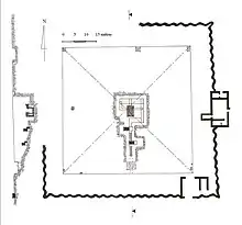 Orientée suivant l'axe nord-sud et d'une base de 52,50 mètres de côtés, la pyramide devait être composée d'un corps de briques recouvert d'un parement de calcaire, parement dont il ne reste que la tranchée qui devait en accueillir les fondations.