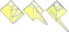 - la pyramide rhomboïdale : pyramide à deux plans inclinés, l’un partant du bas jusqu’au milieu de l’édifice (58° de pente), l’autre allant vers la pointe (43° 22’). Cette rupture de pente serait due à un changement de plan intervenu durant la construction[2] ;