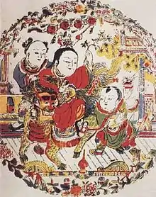 Le Classique des vers utilise l’expression « trace du qilin » (麟趾) pour désigner les descendants du roi Wen des Zhou et vanter leurs talents. Le qilin était réputé comme présage d'une prestigieuse descendance appelée à devenir illustre, et l'on formait le vœu « que le qilin apporte de nobles fils ». Le thème de la licorne donneuse d’un fils promis à une belle carrière (麒麟送子) était autrefois très populaire : il apparait sur les estampes de Nouvel An ou les décorations de mariage[4]. Un jeune garçon ou un jeune homme tenant parfois un lotus entre les mains, vêtu en aristocrate, y est monté sur un qilin en compagnie de la déesse donneuse d’enfants. Dans le sud de la Chine, des « danses de licorne » avaient lieu pendant la période du Nouvel An. Les femmes désireuses d'avoir un fils devaient toucher la frange représentant sa barbichette.