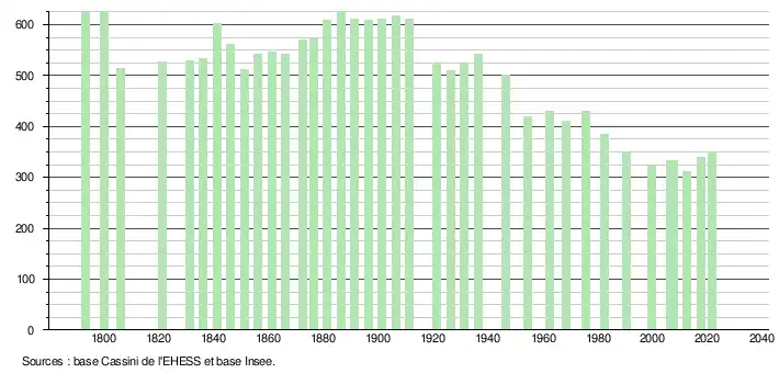 L'évolution du nombre d'habitants est connue à travers les recensements de la population effectués dans la commune depuis 1793. Pour les communes de moins de 10 000 habitants, une enquête de recensement portant sur toute la population est réalisée tous les cinq ans, les populations légales des années intermédiaires étant quant à elles estimées par interpolation ou extrapolation[12]. Pour la commune, le premier recensement exhaustif entrant dans le cadre du nouveau dispositif a été réalisé en 2007[13].
