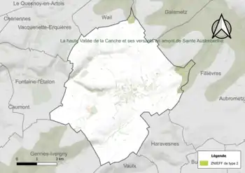 - la haute vallée de la Canche et ses versants en amont de Sainte-Austreberthe qui se situe dans le pays du Ternois. Il offre un relief de coteau abrupt au Nord et des pentes douces au Sud. Le fond de vallée est constitué de pâturages et de zones de cultures. Les versants les plus pentus et inaccessibles accueillent des boisements[13].