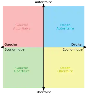 Un exemple de quadrant consiste à considérer l'opinion politique selon deux axes. L'axe économique (gauche-droite) mesure cette opinion selon la façon dont l'économie devrait fonctionner : « gauche » définit un point de vue selon lequel l'économie devrait être dirigée selon un modèle collectif et coopératif, tandis que « droite » définit un point de vue selon lequel l'économie devrait être confiée à des individus ou organisations concurrentes. Le deuxième axe (autoritaire-libertaire) mesure la pensée politique dans un sens social, considérant le degré de liberté individuelle : le « libéralisme » est la conviction selon laquelle la liberté individuelle devrait être maximisée, et l'« autoritarisme » celle selon laquelle l'autorité et la tradition devraient être privilégiées.