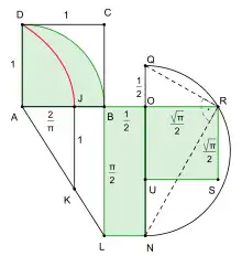 Du point J, on élève un segment JK perpendiculaire à AB et de longueur r. Soit L le point d'intersection entre AK et le côté prolongé BC. D'après la similitude des triangles AJK et ABL, on a . Si à présent l'on prolonge le rayon AB d'un segment colinéaire , BL et BO forment les côtés d'un rectangle OBLN, dont la surface est celle du quart de cercle. Il reste à former un carré de même surface, ce qui s'obtient au moyen des relations métriques dans le triangle rectangle et du théorème de Thalès.