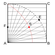 Soit ainsi l'angle BAE ( ≤ 90°) : on construit sur sa base AB un carré ABCD et l'on forme la quadratrice inscrite grâce au mécanisme décrit ci-dessus. L'autre côté de l'angle recoupe la quadratrice au point G, et la droite parallèle au côté AB issue de G intercepte le côté AD du carré au point F; le segment AF est proportionnel à l'arc BE ou, plus précisément, le rapport de longueurs AF/AD est égal au rapport des longueurs d'arcs BE/BD.