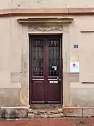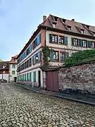 - Formant l'angle avec le no 12 de la rue des Moulins, cette maison date de 1817 comme en témoigne le millésime figurant sur le linteau de la porte d'entrée, qui porte également les initiales du propriétaire, G. M. pour Gaspard May, acquéreur du moulin Dinsenmühle et commanditaire de cette maison[9].