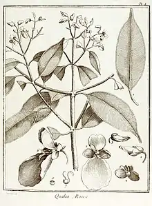 Le Qualier croît dans les forêts de la Guiane qui s'étendent au bord de la rivière de Sinémari, à douze lieues de ſon embouchure. II étoit en fleur dans le mois de Septembre.