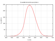 - Un photon à cette même longueur d'onde représente 2,44×10−16 lm·s.