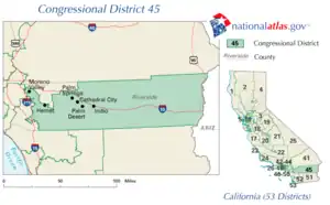 De 2003 à 2013, ce district était basé dans le Comté de Riverside. Le district comprenait les communautés de Palm Springs, Moreno Valley, Palm Desert, Hemet, Cathedral City, Temecula, Blythe, Rancho Mirage, Murrieta, Indio, Indian Wells, La Quinta, Cabazon, Anza, Thermal, Idyllwild, Coachella et d'autres communautés non constituées en société. régions du Comté de Riverside.