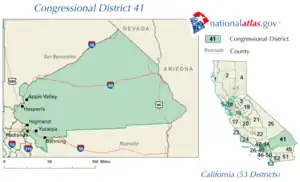 À partir du redécoupage de 2020, le 41e district congressionnel de Californie est situé dans l'Inland Empire, en Californie du Sud. Elle est entièrement située dans l'ouest du Comté de Riverside.