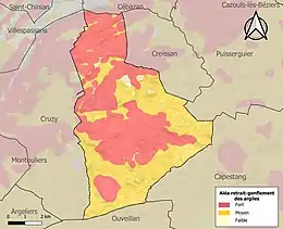 Le retrait-gonflement des sols argileux est susceptible d'engendrer des dommages importants aux bâtiments en cas d’alternance de périodes de sécheresse et de pluie. 99 % de la superficie communale est en aléa moyen ou fort (59,3 % au niveau départemental et 48,5 % au niveau national). Sur les 963 bâtiments dénombrés sur la commune en 2019, 963 sont en aléa moyen ou fort, soit 100 %, à comparer aux 85 % au niveau départemental et 54 % au niveau national. Une cartographie de l'exposition du territoire national au retrait gonflement des sols argileux est disponible sur le site du BRGM[21],[Carte 2].